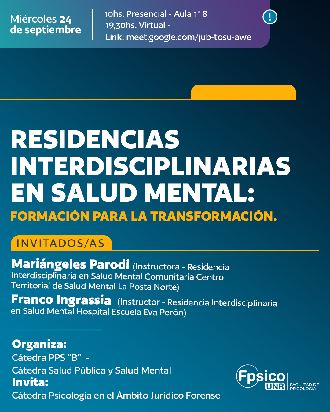 Invitados/as:Mariángeles Parodi(Instructora – Residencia Interdisciplinaria en Salud Mental Comunitaria Centro Territorial de Salud Mental La Posta Norte) Franco Ingrassia(Instructor – Residencia Interdisciplinaria en Salud MentalHospital Escuela Eva Perón) Miércoles 24 de septiembre.10.00hs Aula 1° 8 Miércoles 24 de septiembre. 19.30hs Virtual: meet.google.com/jub-tosu-awe Organizan:– Cátedra PPS “B”– Cátedra Salud Pública y Salud Mental Invita:– Cátedra Psicología en el Ámbito...Read More