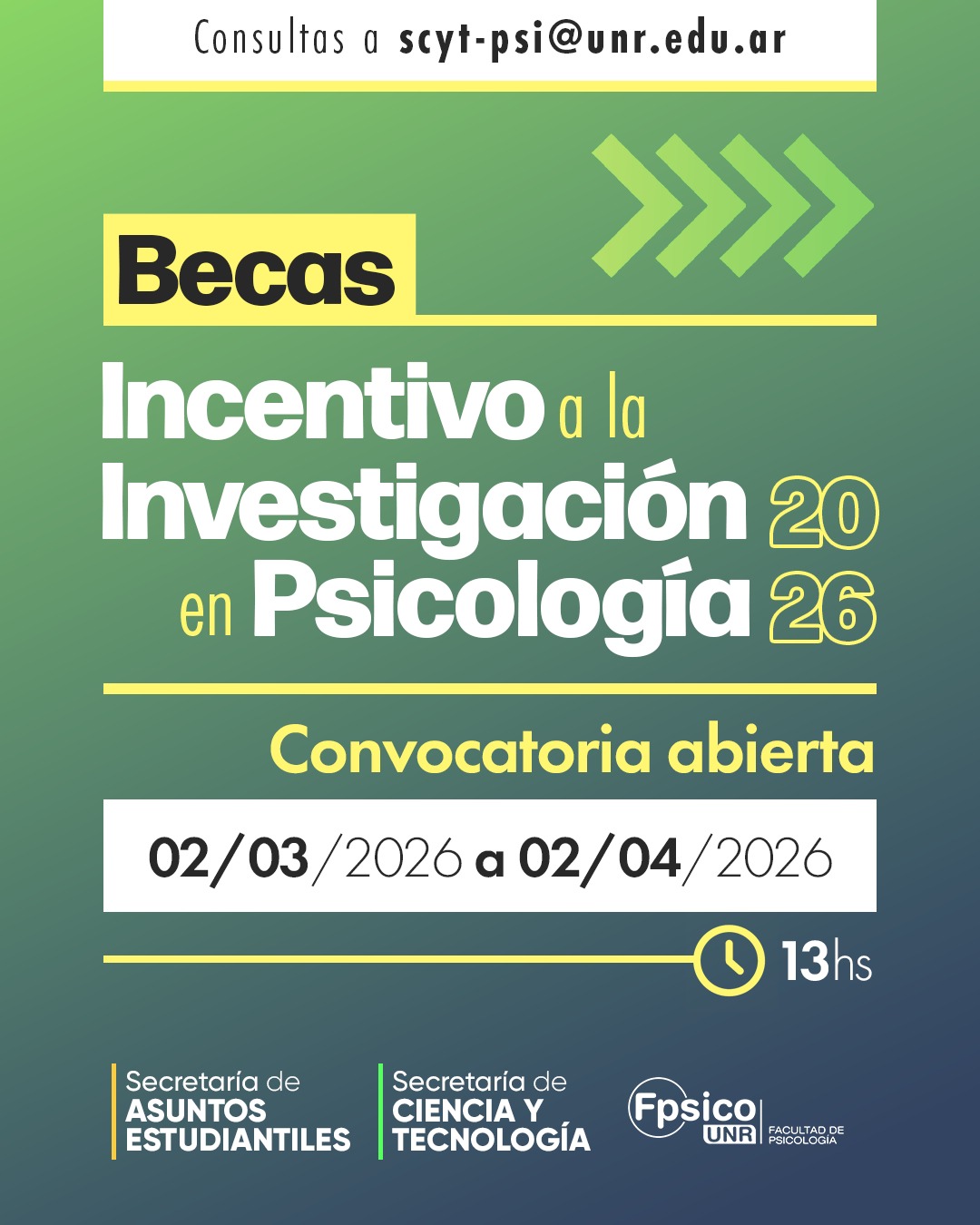 La Facultad de Psicología (UNR), a través de la Secretaría de Ciencia y Tecnología y la Secretaría Estudiantil, convoca a estudiantes regulares de 2do. a 6to. Año de la Carrera de Psicología que deseen fortalecer su formación en investigación, a postularse a las Becas de Incentivo a la Investigación en Psicología 2026. Las/los aspirantes deberán tener...Read More